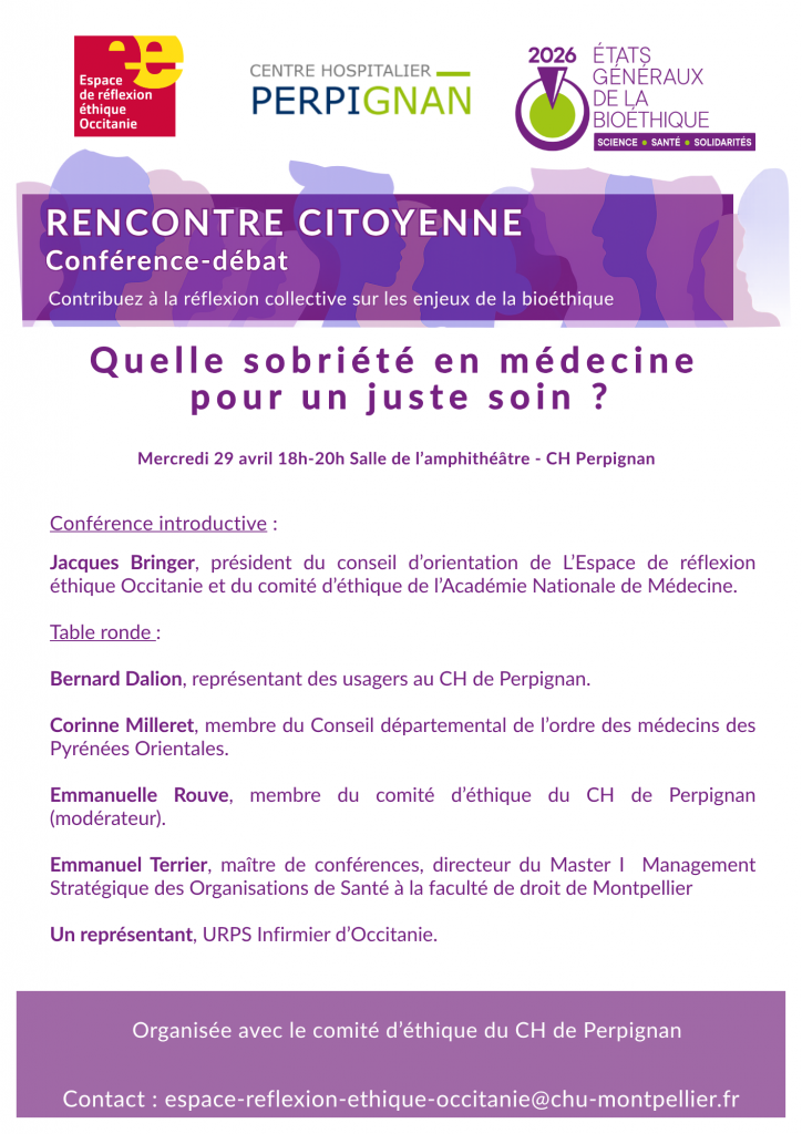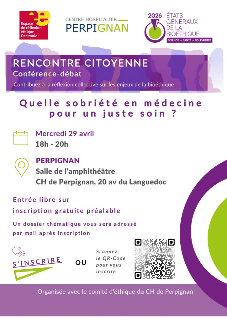 A cette occasion, l’Espace de réflexion Occitanie (EREO), en partenariat avec le Comité d’éthique du CH de Perpignan, a le plaisir de vous inviter à une rencontre citoyenne sur le thème : Quelle sobriété en médecine pour un juste soin ?