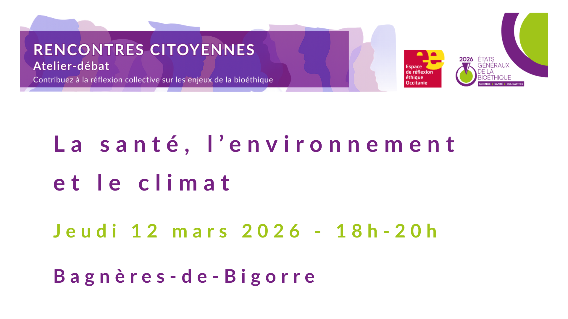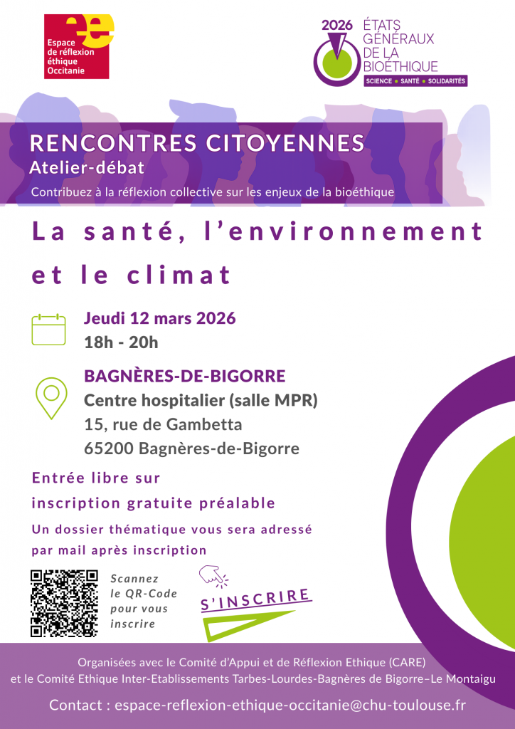 À l’occasion des États Généraux de la Bioéthique, l’Espace de réflexion éthique Occitanie (EREO), en partenariat avec le Comité d’Appui et de Réflexion Ethique (CARE) et le Comité Ethique Inter-Etablissements Tarbes-Lourdes-Bagnères de Bigorre – Le Montaigu, a le plaisir de vous inviter à une rencontre citoyenne sur le thème :