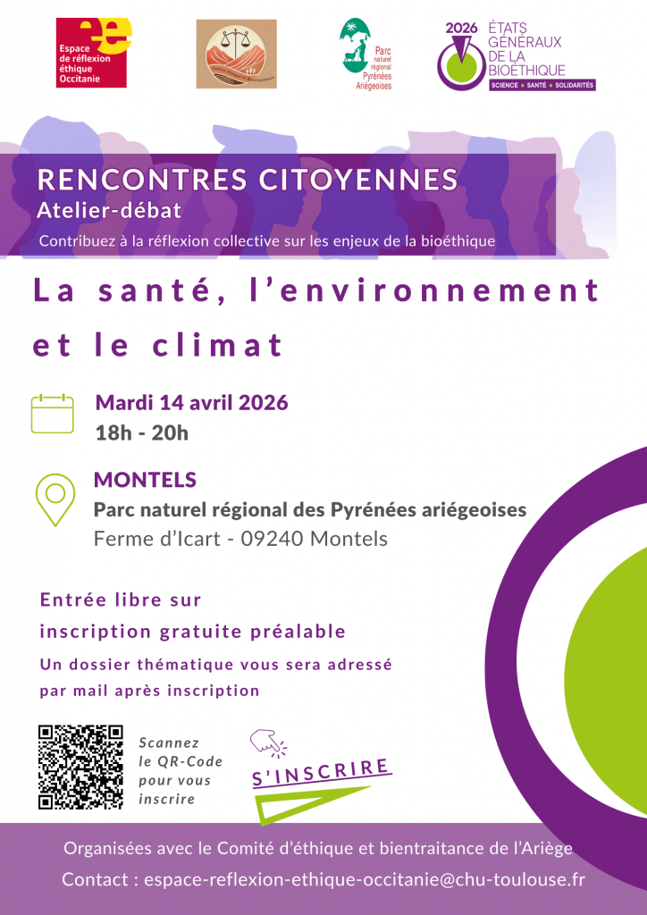 À l’occasion des États Généraux de la Bioéthique, l’Espace de réflexion éthique Occitanie (EREO), en partenariat avec le Comité d’éthique et bientraitance de l’Ariège, a le plaisir de vous inviter à une rencontre citoyenne sur le thème :