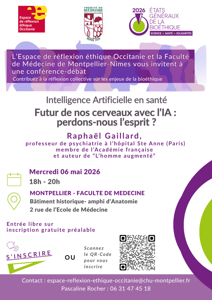 L’Espace de réflexion éthique Occitanie, en partenariat avec la Faculté de Médecine de Montpellier-Nîmes, a le plaisir de vous inviter à une rencontre citoyenne. Cliquez ici pour vous inscrire ou scannez le QR Code sur l’affiche ci-dessous